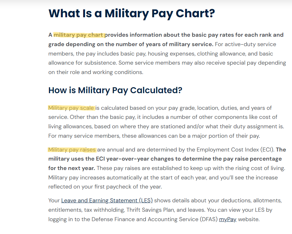 Here’s an example of mindfully using keywords in your content. We created this article for a client to target the keyword “military pay chart.” Notice how, instead of focusing solely on the primary keyword, we used secondary keywords like “military pay scale” and “military pay raises.”